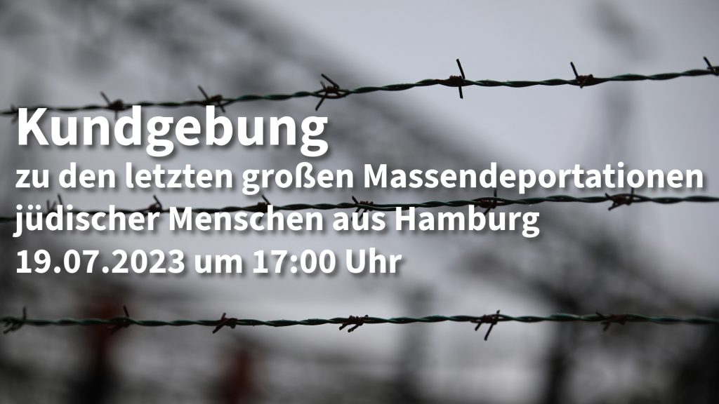 Kundgebung zu den letzten großen Massendeportationen jüdischer Menschen aus Hamburg vor 81 Jahren am 19. Juli 2023 Vor den Namenstafeln der Juli-Deportieren von 1942 am Haupteingang … Veranstaltungshinweis: Erinnerung an die Deportationen von der Sternschanze weiterlesen